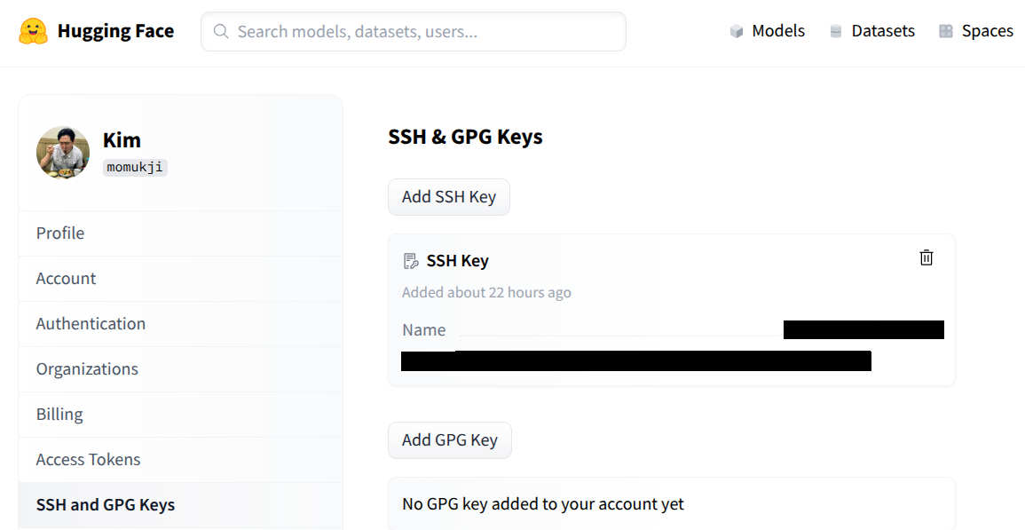Huggingface 의 모델을 사용하기 위한 사용자 설정방법에 대하여 살펴보겠습니다. 참고로 별도의 요금부과는 없으니 안심하고 절차를 진행하면 됩니다. 우선 사용자 PC를 등록절차를 진행합니다. 현재 작업하는 시스템의 고유값인 ssh 암호값을 생성한 뒤 이를 Huggingface 의 사용자 정보게 등록합니다.